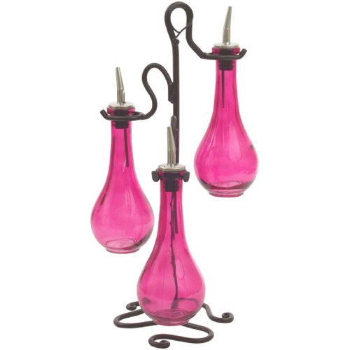 Retro Kitchen Decor Vinegar and Oil Dispenser, Olive Oil Bottle, G34 Vinegar Bottle ~ Decorative Liquid Dispenser Bottle ~ 3 Fuchsia Drop Bottles w/ Pour Spouts & Metal Stand Review